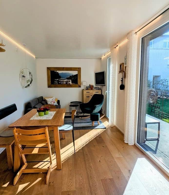 Offene Wohnbereiche, ruhige Schlafzimmer und der Blick ins Grüne schaffen eine Atmosphäre zum Ankommen und Abschalten. Der Garten erweitert den Wohnraum und lädt zum Ankommen, Abschalten und Zussammensein ein.